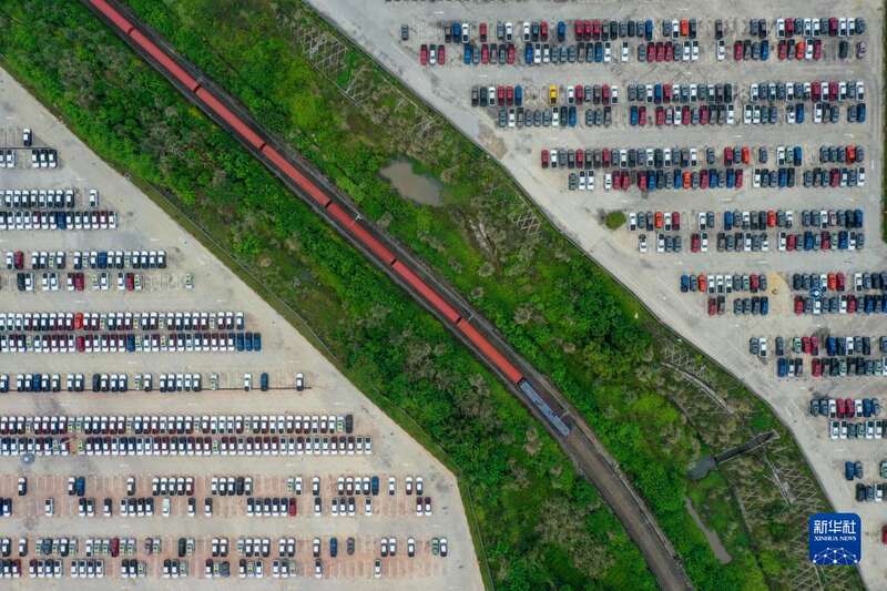 长城汽车专列首发列车在重庆永川国家高新区铁路专用线上(4月14日摄,无人机照片)。新华社记者 唐奕 摄