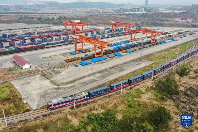 中老铁路(江津-万象)国际货运首发列车从重庆江津珞璜物流园片区的小南垭铁路物流中心驶出(3月2日摄,无人机照片)。新华社记者 唐奕 摄
