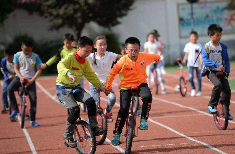 ↑2017年5月4日,西安市马腾空小学四年级学生王文博(前右)和魏小凯(前左)手拉手练习独轮车骑行。新华社记者李一博摄