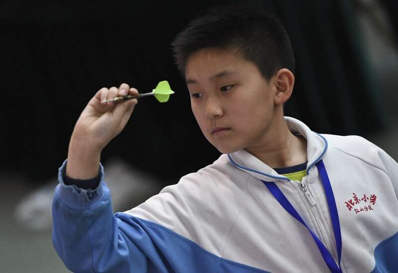 ↑2017年3月18日,来自北京小学红山分校的11岁小将黄培元在第六届“联创世纪”京都飞镖群英会青少年组预赛中。 新华社记者夏一方摄