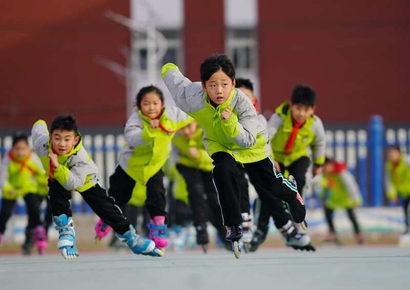 ↑2021年12月15日,在河北省滦州市第三实验小学,学生们在体育课上练习轮滑。新华社记者 杨世尧摄