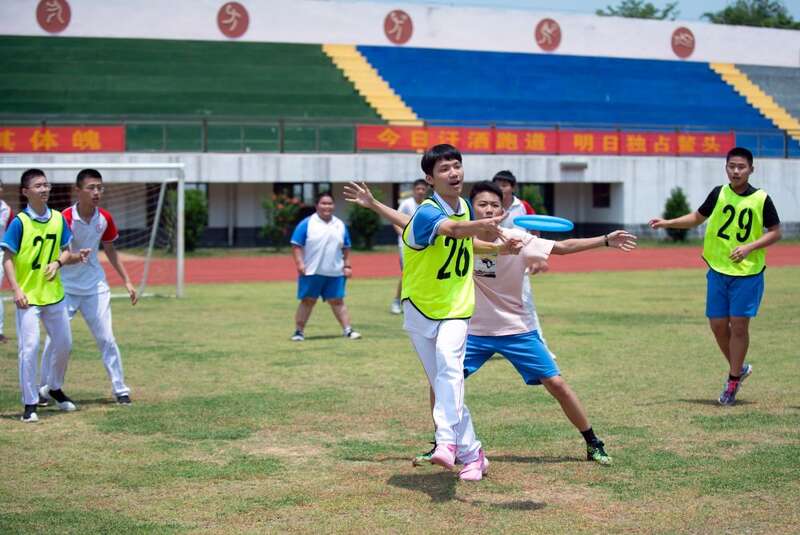 ↑2020年5月12日,北京师范大学海口附属学校的学生在体育课上练习极限飞盘。 新华社记者 张丽芸摄
