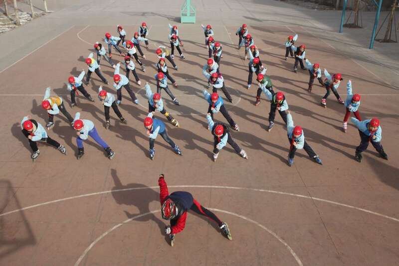 ↑2015年12月25日, 河北张家口经开区小学轮滑队员在教练带领下进行基础动作训练。 新华社发(武殿森摄)