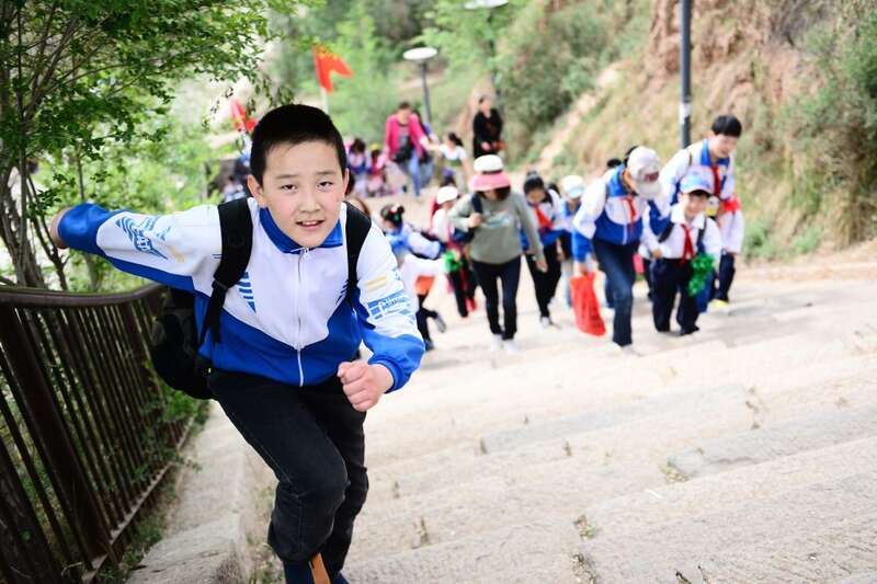 ↑2014年5月30日,西宁市玉井巷小学一名学生在登山活动中。新华社记者 张宏祥 摄