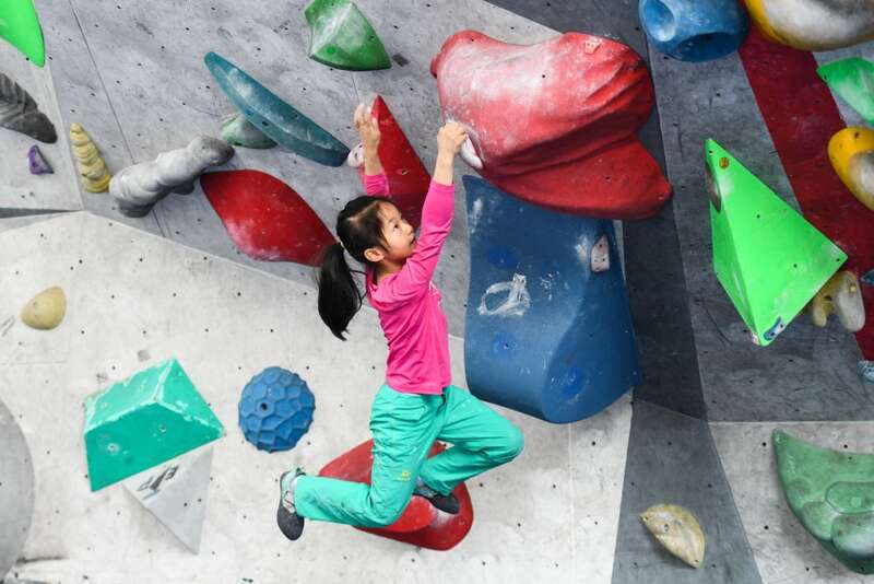 ↑2018年3月10日,广西梧州选手汤茹茜在2017-2018全国青少年U系列攀岩联赛东莞站U9女子攀石赛预赛中。新华社记者黄国保摄