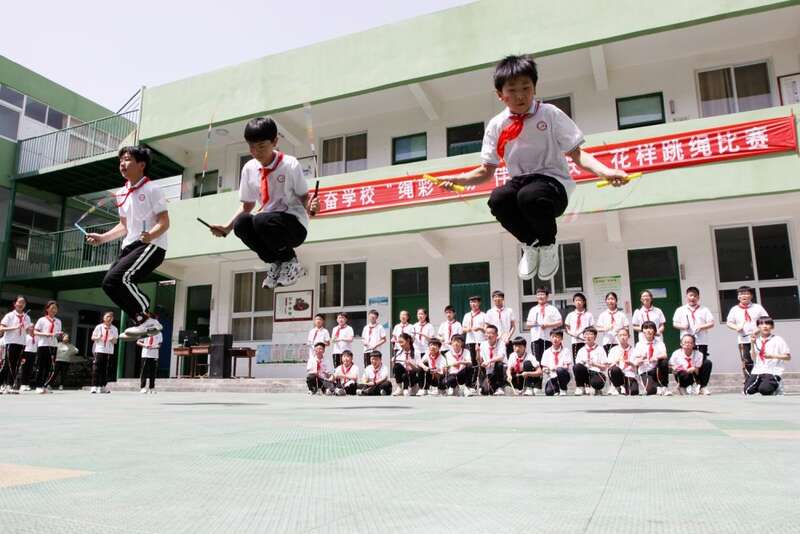 ↑2021年4月29日,河南省博爱县勤奋小学举行花样跳绳比赛。 新华社发(程全 摄)