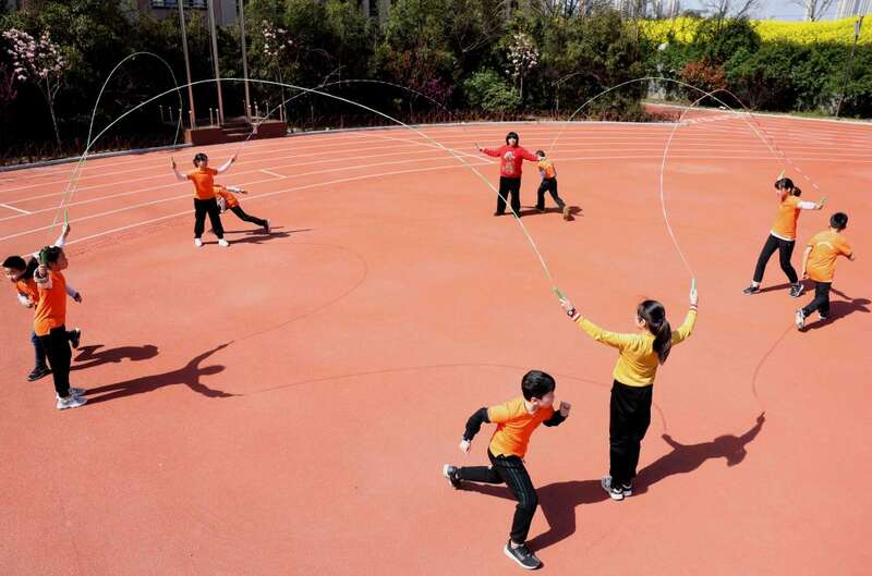 ↑2021年3月23日,在合肥市大通路小学新海校区,学生在大课间练习花样跳绳。新华社发(解琛 摄)