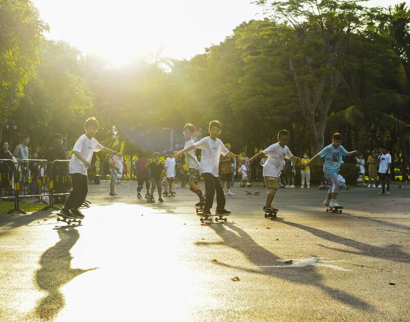↑2021年9月4日,参赛选手在海南省海口市万绿园的一场趣味滑板比赛中。新华社记者 周佳谊 摄