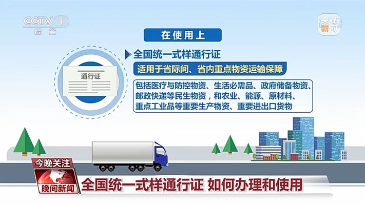 在使用上,全国统一式样通行证,适用于省际、省内重点物资运输保障,包括医疗与防控物资、生活必需品、政府储备物资、邮政快递等民生物资,和农业、能源、原材料、重点工业品等重要生产物资、重要进出口货物。对于国内其他地区发放的全国统一式样通行证的货运车辆,予以认可。