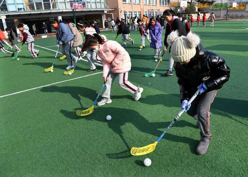 2022年1月11日,山东省青岛市基隆路小学的同学们在体育课上练习旱地冰球。新华社记者李紫恒摄