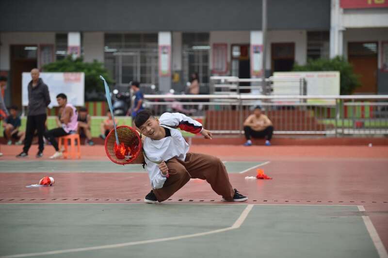 2021年11月4日,在广西崇左大新县民族高级中学,一名学生用背篓接绣球,通过传统民族体育运动强身健体。新华社记者刘岭逸摄