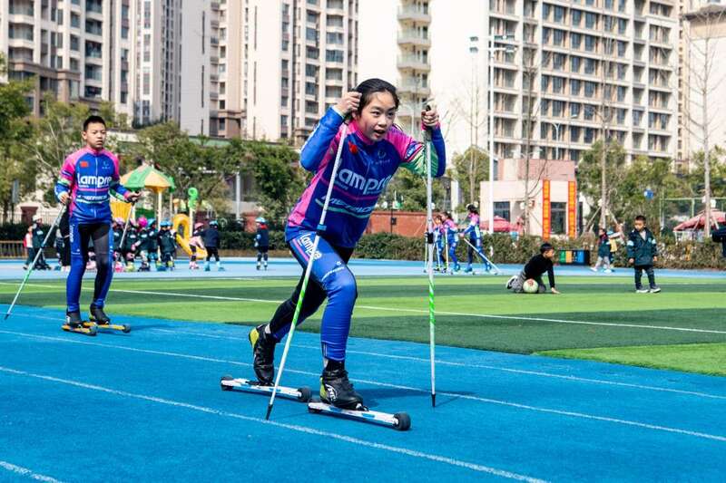 2022年2月24日,在重庆树人博文小学的冰雪运动体育课上,孩子们正在练习旱地滑雪。新华社记者唐奕摄