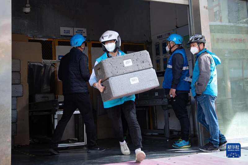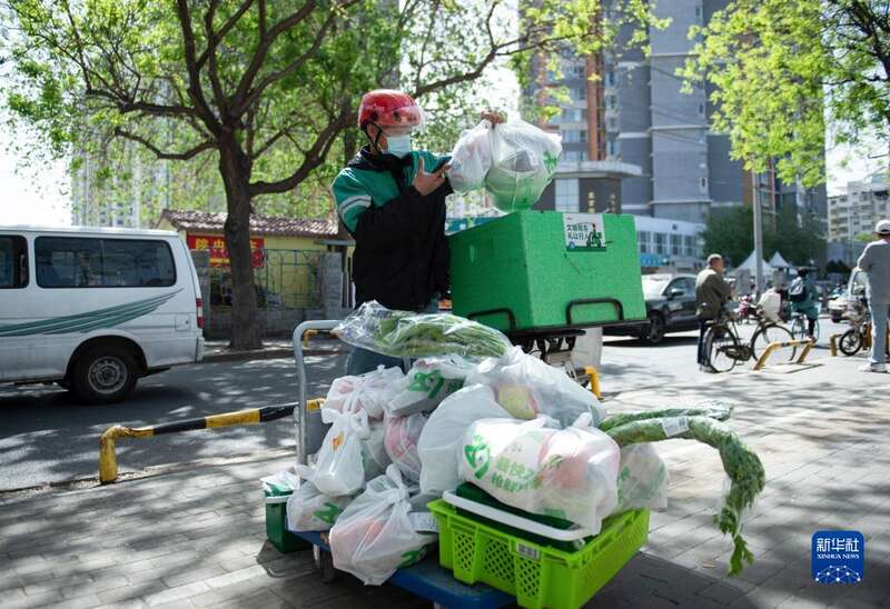 4月26日,在北京市朝阳区,盒马鲜生配送员取到货物后送货。