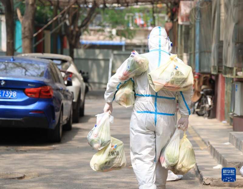4月24日,朝阳区劲松街道社区工作者为封控区居民送蔬菜包。