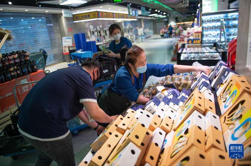 4月26日,在位于北京市朝阳区十里堡的盒马鲜生超市,员工在开店营业前上货。