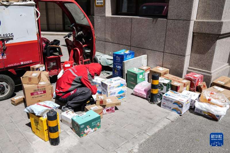 4月26日,在北京市朝阳区广和里西路一小区(防控区内)门口,快递员在整理货品准备投递。