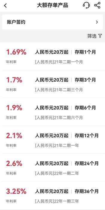 农业银行的部分期限大额存单利率也已调整。目前20万元起存的大额存单,3年期年利率从3.35%降至3.25%,两年期的则从2.7%降至2.6%。