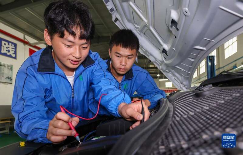 4月27日,在贵州省黔东南苗族侗族自治州岑巩县中等职业学校,学生在实训室学习汽车修理技术。