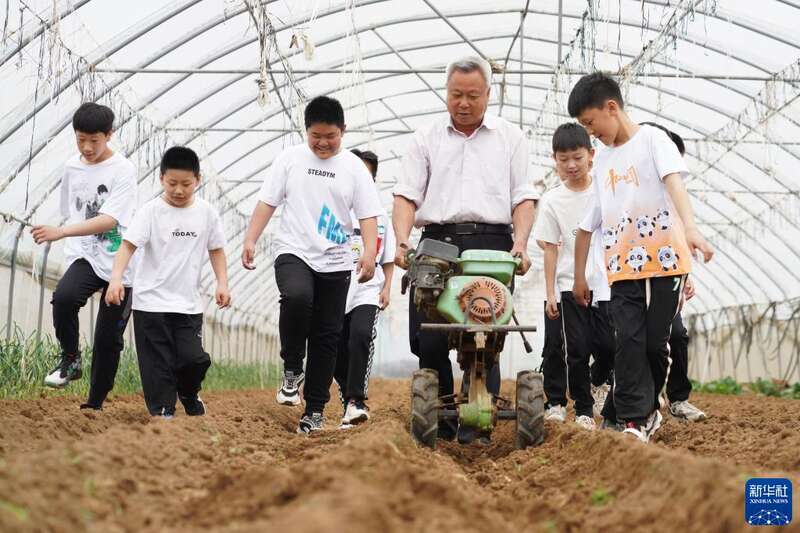 4月27日,邢台市内丘县韩庄小学学生在蔬菜基地学习农机操作。