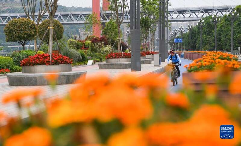 4月29日,市民在重庆市江北区北滨路漫行步道的自行车道上骑行。
