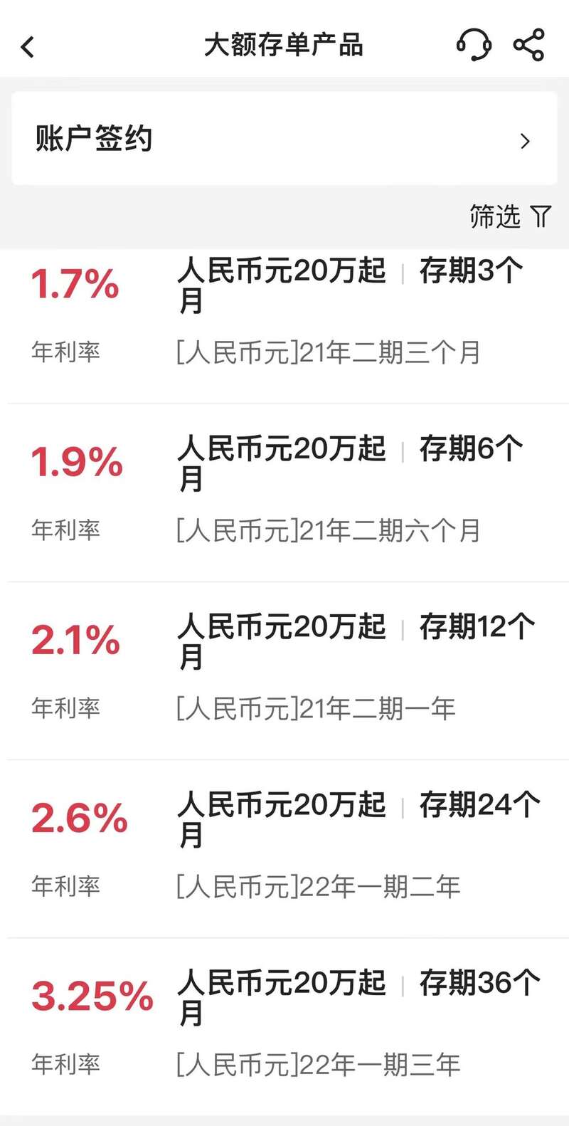中国银行App显示,目前,1年期、2年期和3年期大额存单利率分别为2.1%、2.6%和3.25%,2年期和3年期大额存单利率较之前均下行,此前2年期和3年期大额存单利率分别为2.7%和3.35%。
