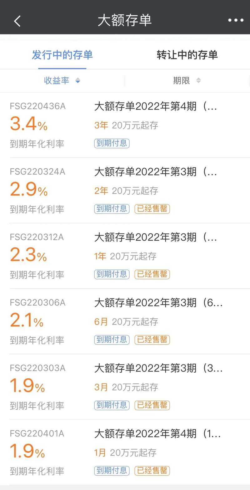 记者通过银行网点实地走访、App查询等方式了解到,在售大额存单中很难见到年利率在3.5%以上的产品。不少银行1年期、2年期、3年期的大额存单额度较为紧张,甚至部分已售罄。