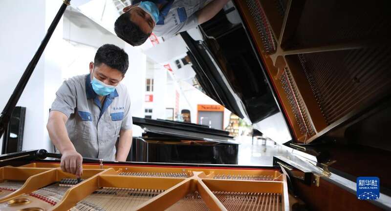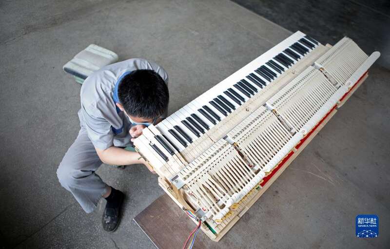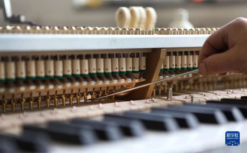 4月26日,刘玉磊在车间内对已装配好的钢琴进行初步调律。新华社记者 王乙杰 摄