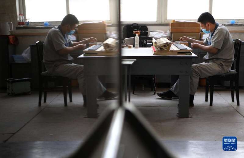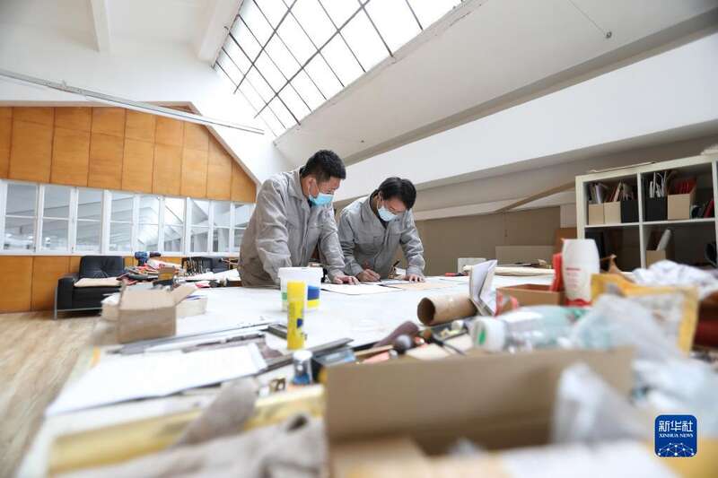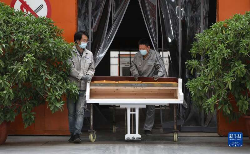 4月27日,刘玉磊和他的师父郭凯(左)将组装好的三角琴琴体推送到装配车间。新华社记者 王乙杰 摄