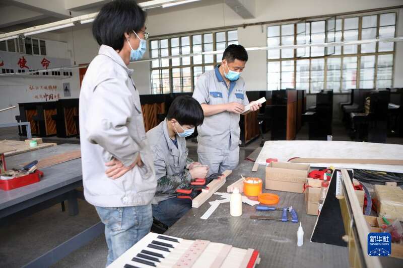 4月26日,刘玉磊(右)和他的师父郭凯(左)以及刘玉磊的徒弟孙义泽在车间解决钢琴部件问题。新华社记者 王乙杰 摄