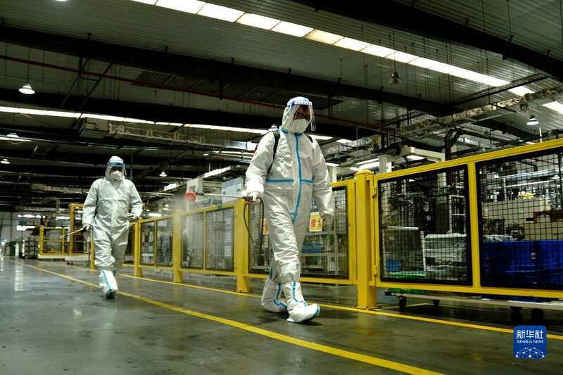 4月29日,上海加冷松芝汽车空调股份有限公司工人在生产车间进行消杀。