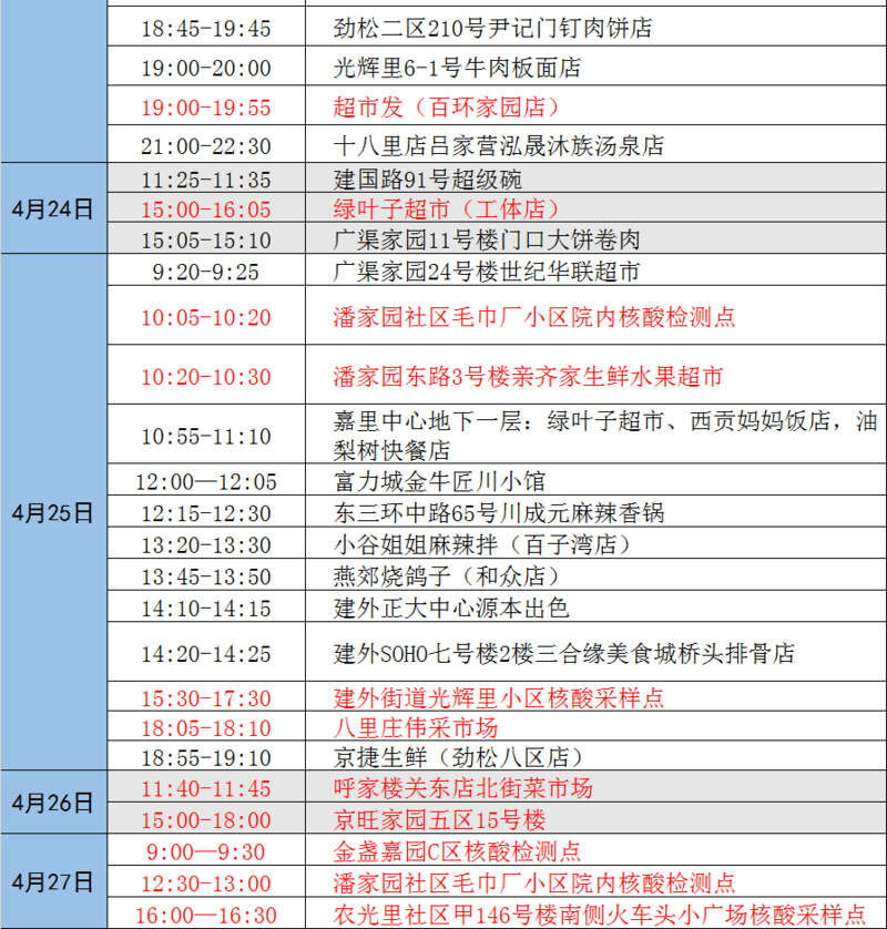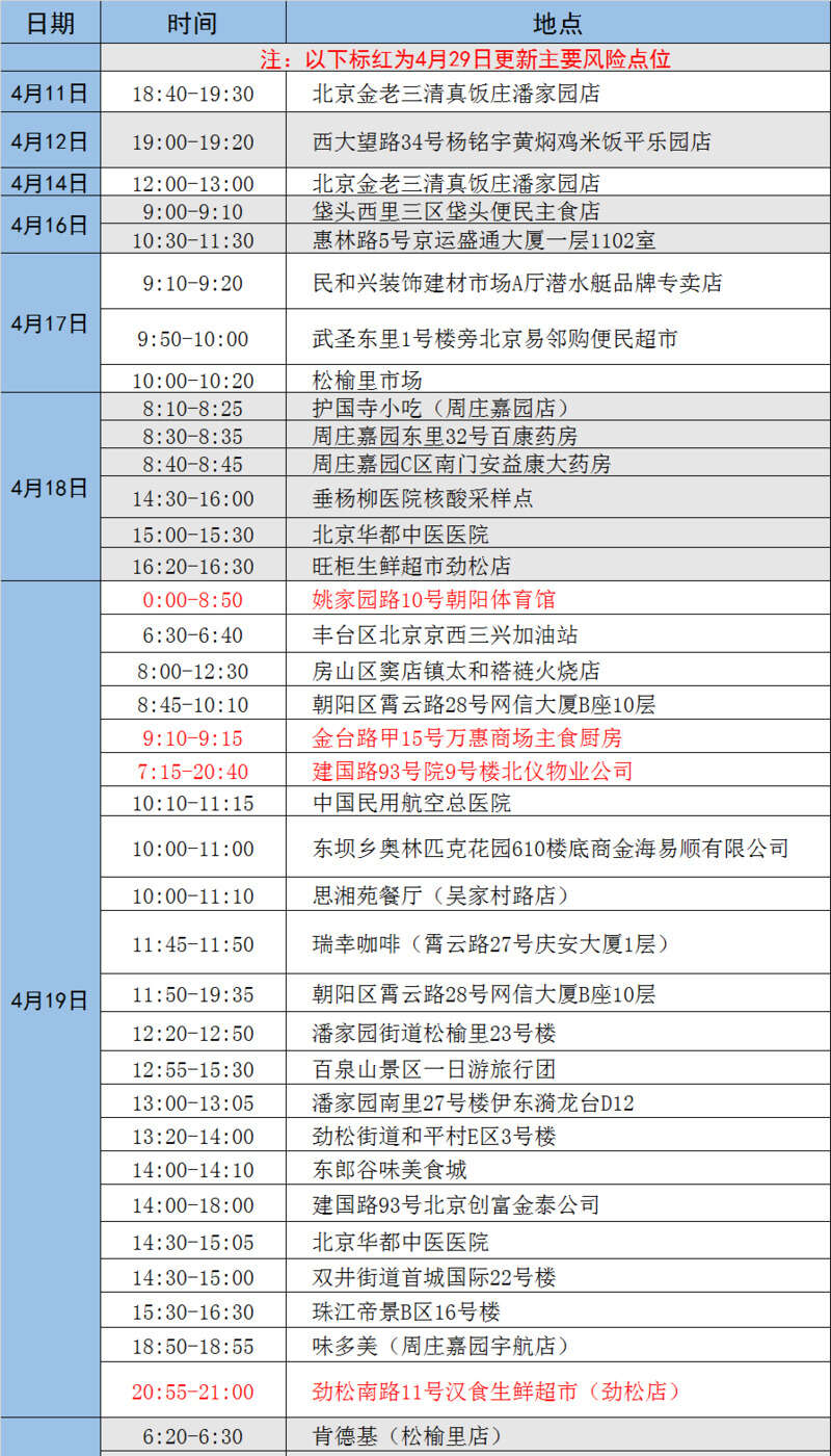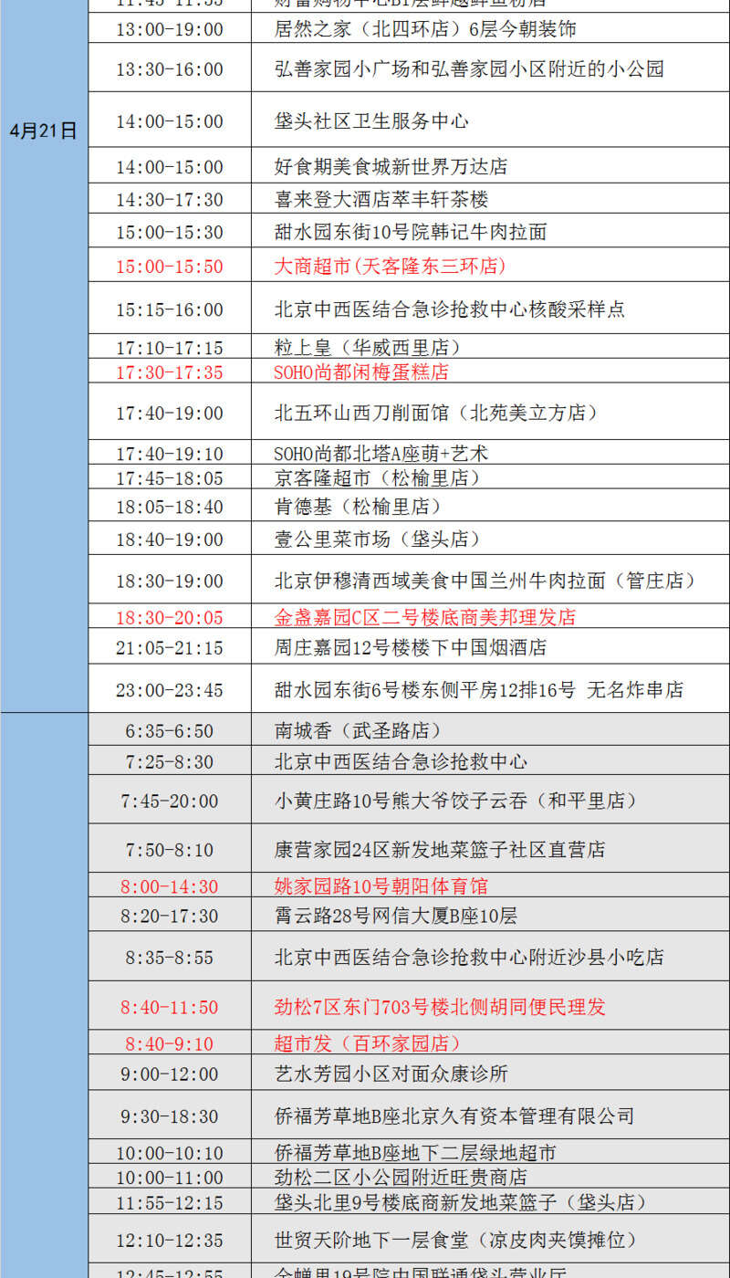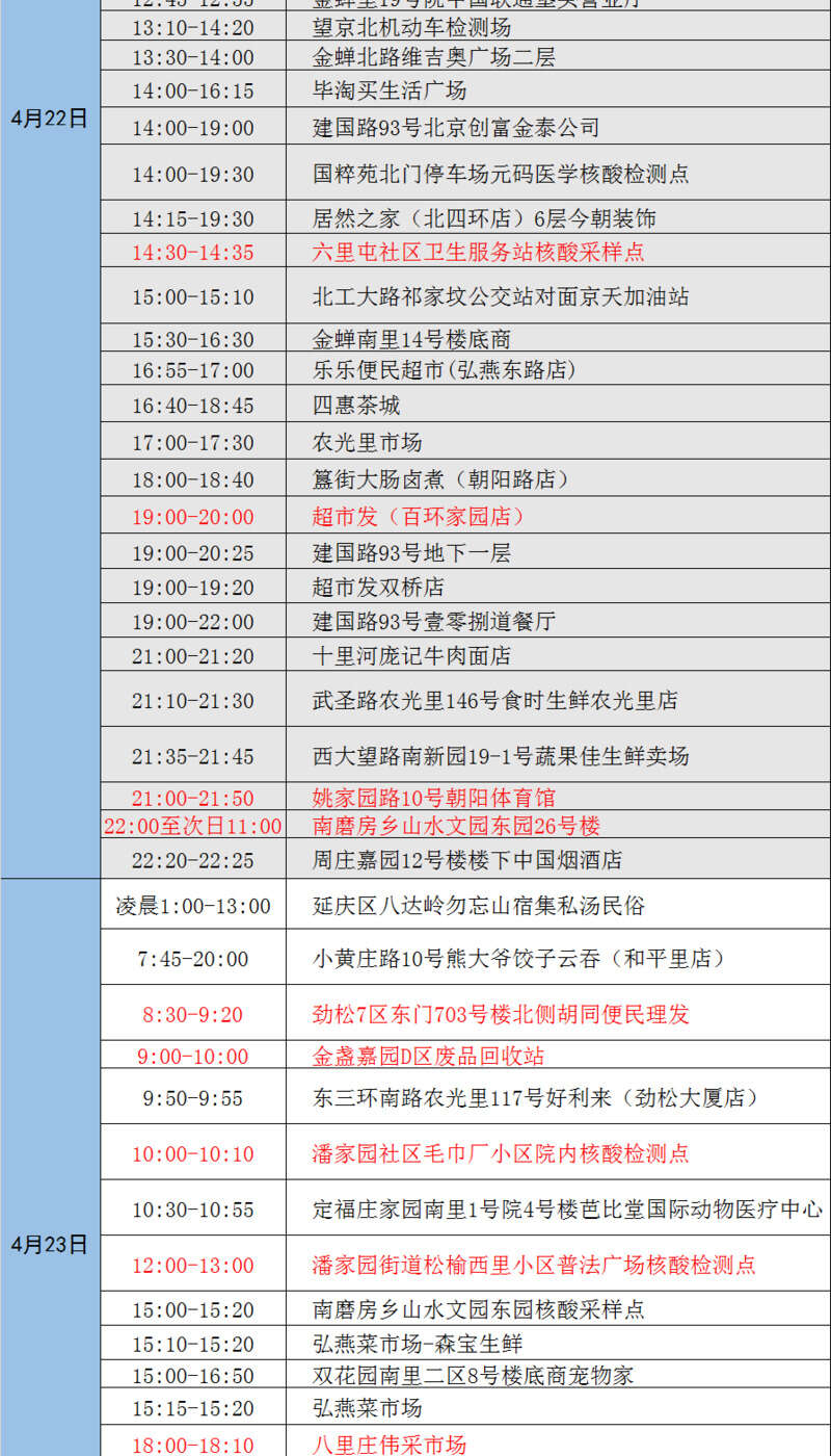 北京市近日突发数起疫情,涉及多条传播链,续发和隐匿传播风险高,情况紧急,形势严峻。根据疫情防控要求,请与下列轨迹有时空交集或近期接到健康宝弹窗提示的人员,立即主动向所在社区(村)、工作单位、居住酒店报告,或者拨打朝阳疾控部门热线电话87789709报告。