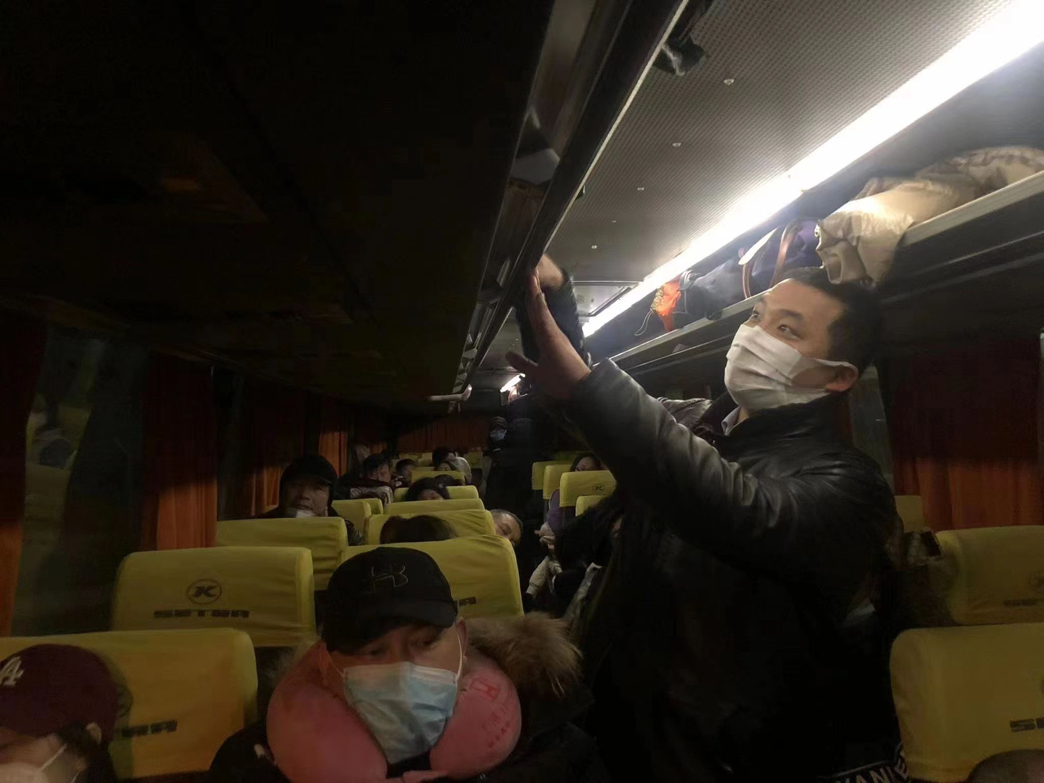 中国驻摩尔多瓦使馆政治处主任姜明政正在摩尔多瓦帕兰卡口岸的撤侨大巴上帮助侨胞整理行李。