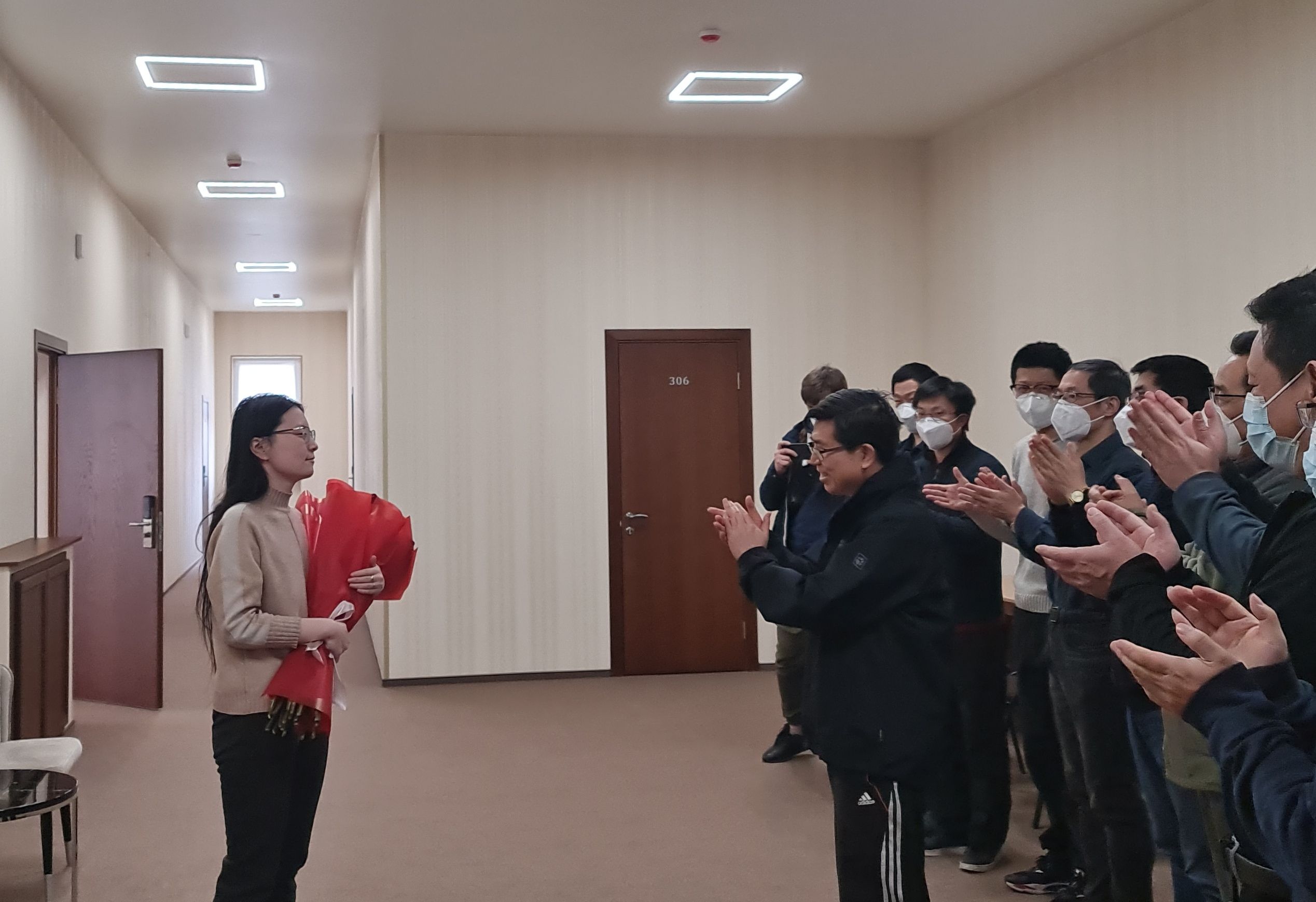 2022年3月8日,中国驻乌克兰使馆领侨处主任李琳在战斗一线迎来了自己的生日,中国驻乌克兰大使范先荣和使馆同志们为她送上了一捧鲜花。