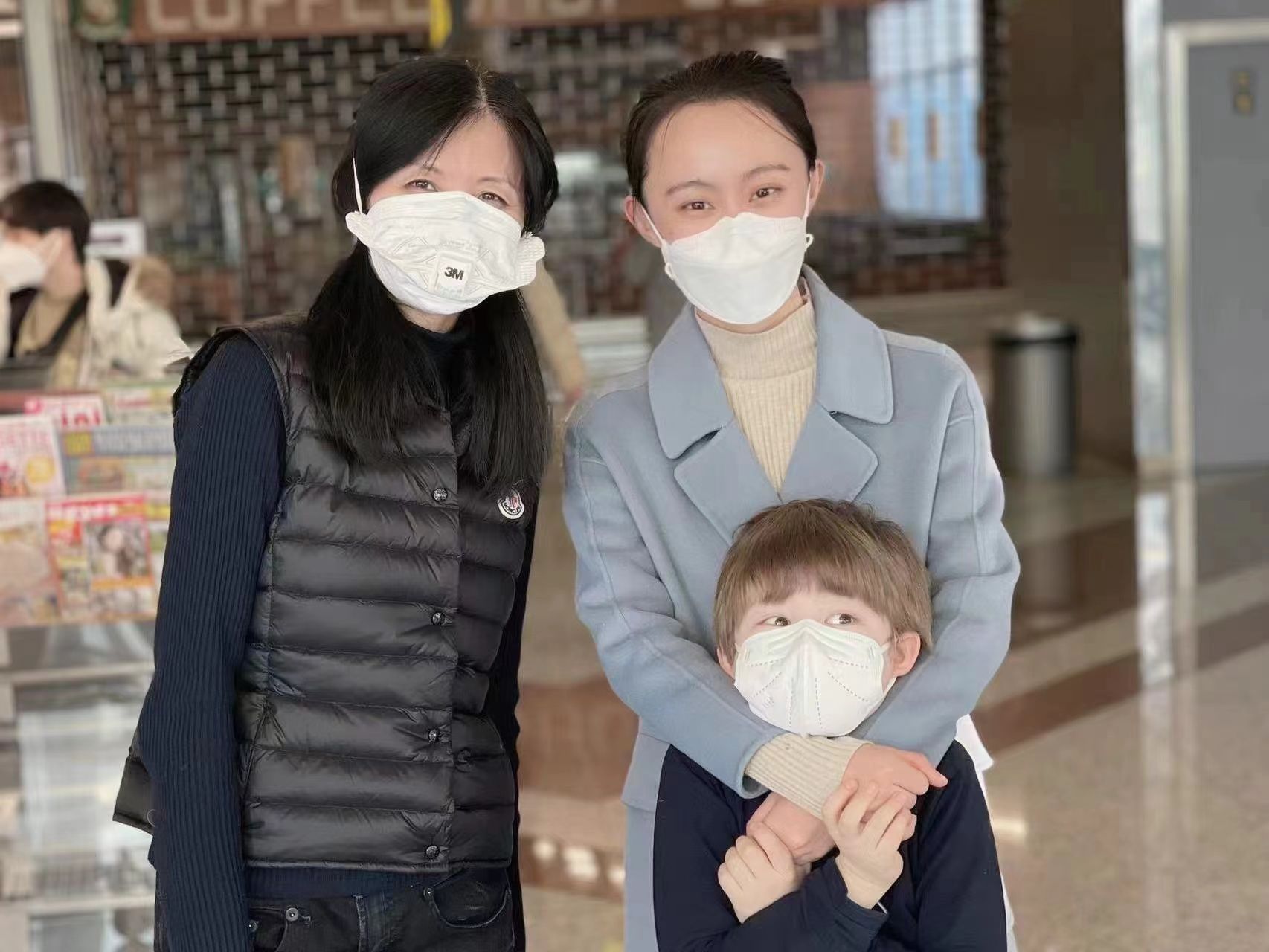 中国驻斯洛伐克使馆职员付云舒(右)和一对安全撤离的母子。