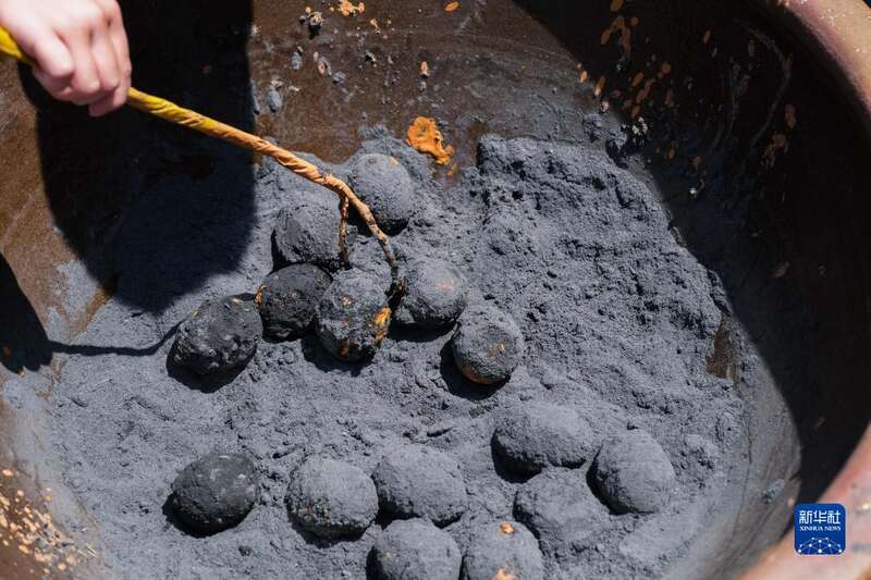 5月3日,孩子们在村民的带领下用黄泥、草木灰等制作传统灰鸭蛋(咸鸭蛋)。