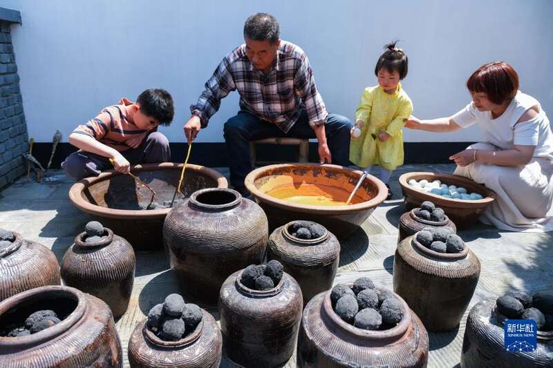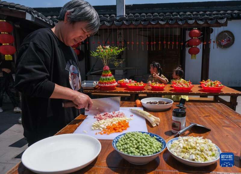 临近立夏节气,浙江省杭州市临平区塘栖镇丁山河村的村民们举行“传统民俗迎立夏”活动。村民们搭土灶、生火,烧野米饭(又称乌米饭),腌灰鸭蛋(咸鸭蛋),做米塑“立夏狗”等,用水乡传统民俗迎接立夏节气。