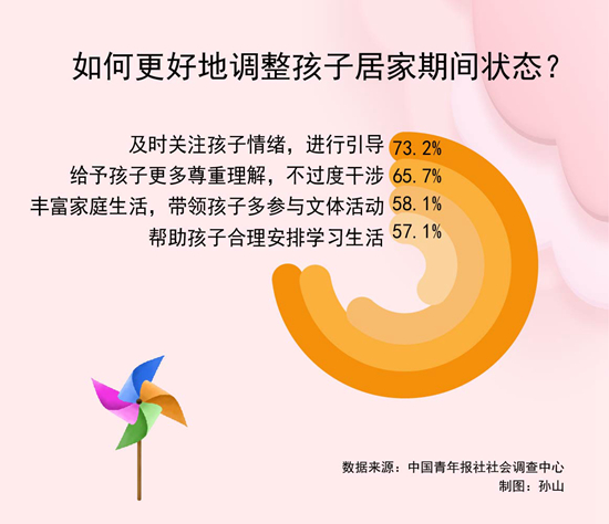 要更好地调整孩子居家期间的状态,73.2%的受访家长认为要及时关注孩子的情绪,进行引导、纾解,65.7%的受访家长认为要给予孩子更多尊重理解,不过度干涉。其他方面还有:丰富家庭生活,带领孩子多参与文体活动(58.1%),家长帮助孩子合理安排学习生活(57.1%),帮助孩子提高居家生活能力(34.3%)等。