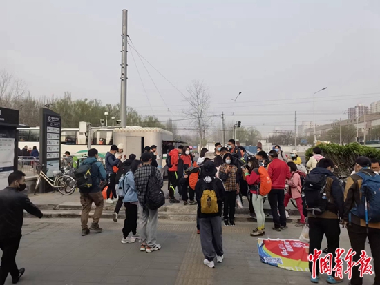 在牡丹园地铁站外集合的徒步者们。 焦晶娴/摄
