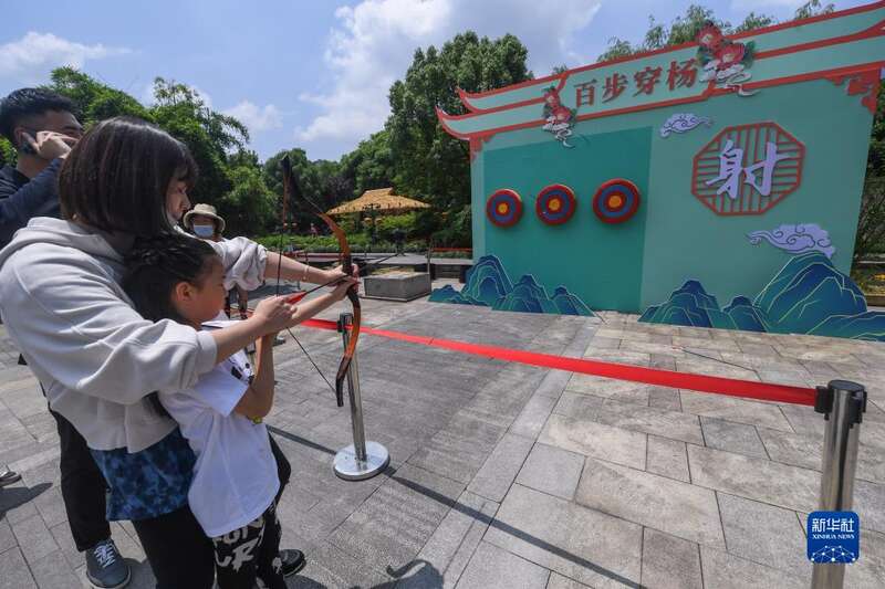 5月22日,游客在径山镇的陆羽文化街区体验传统游戏。