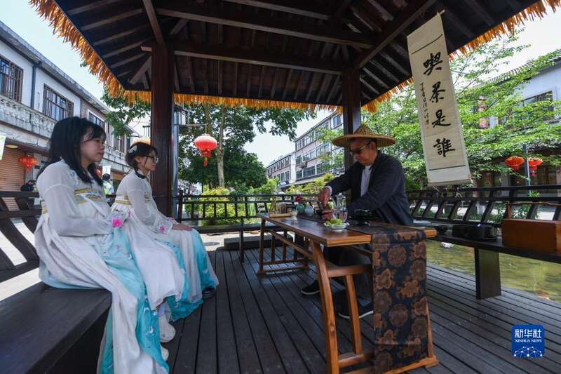 5月22日,游客在径山镇的陆羽文化街区观看茶艺表演。
