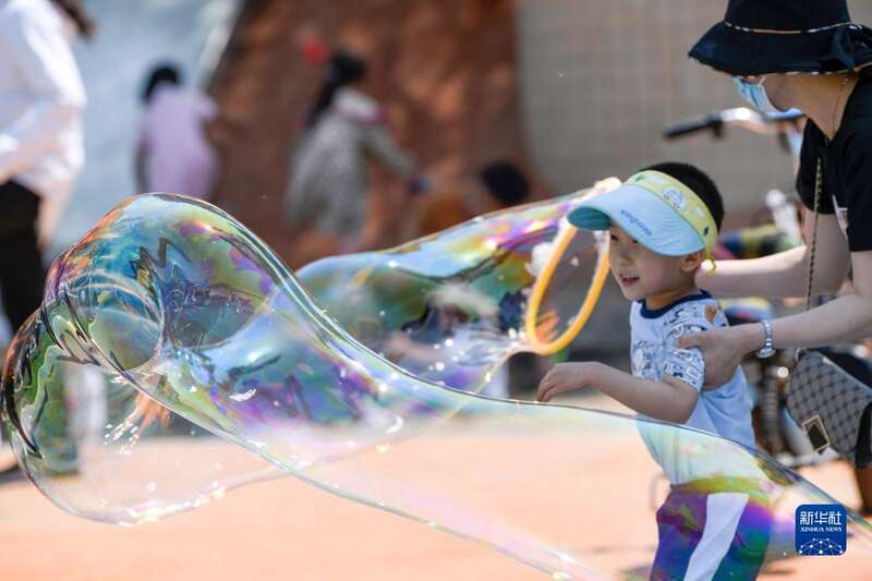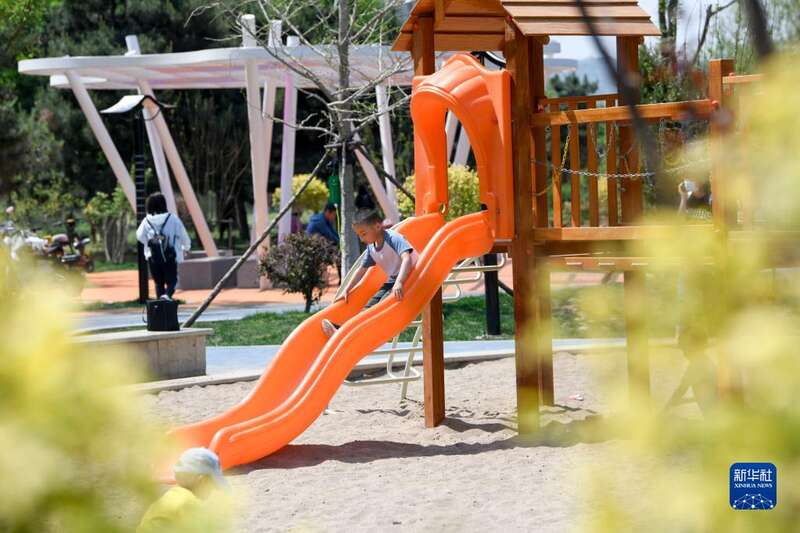 5月22日,小朋友在承德市双桥区一处“口袋公园”玩耍。