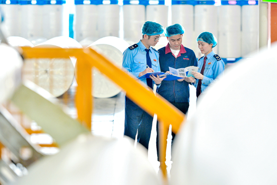 2022年5月18日,浙江省湖州市,长兴县和平镇一家非织造布生产企业内,和平税务所工作人员辅导企业了解相关减税政策。视觉中国供图