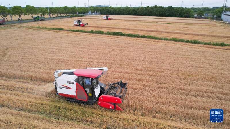 5月21日,在浙江省湖州市长兴县画溪街道长桥村,农民驾驶收割机收割小麦(无人机照片)。