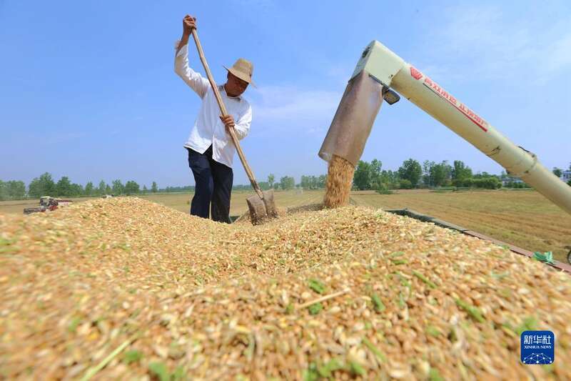 5月23日,在安徽省淮北市烈山区烈山镇,农民在麦田里收获小麦。