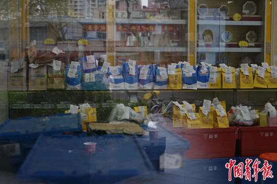 4月12日,上海市黄浦区,豫园街道,一家营业的药店柜台上摆满了等待配送的药。