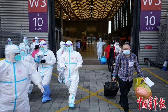 4月12日,上海新国际博览中心方舱医院,W3舱的一批新冠肺炎感染者康复出院。