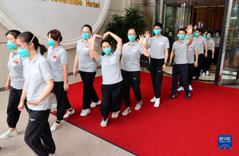 5月24日,浙江援沪医疗队的队员们列队走出位于上海市浦东新区的驻地准备乘坐大巴返浙。
