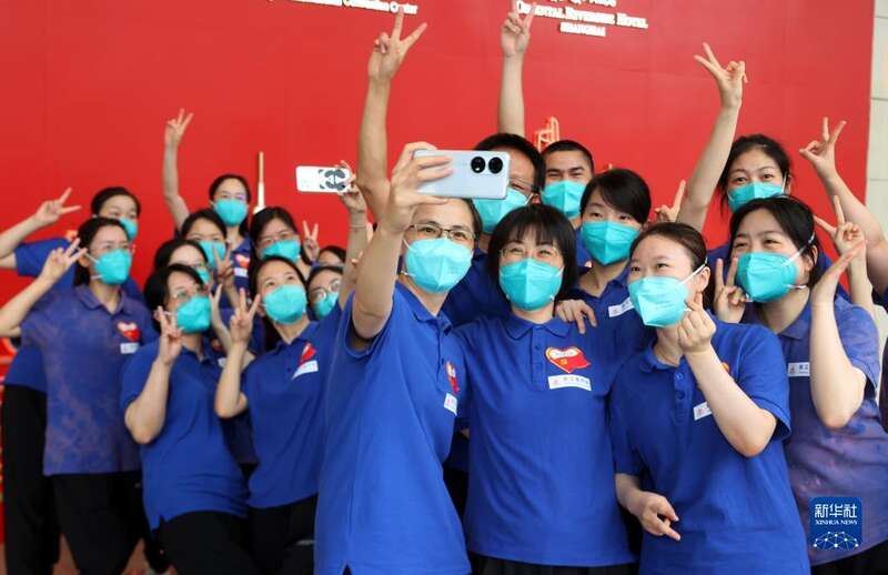 5月24日,浙江援沪医疗队的队员们在位于上海市浦东新区的驻地外用手机自拍。