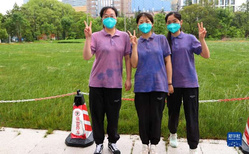 5月24日,三位来自浙江省人民医院的援沪医疗队队员在驻地外的草坪前合影,身上经过消毒水喷洒褪色的外衣被她们称为“消毒水迷彩服”。
