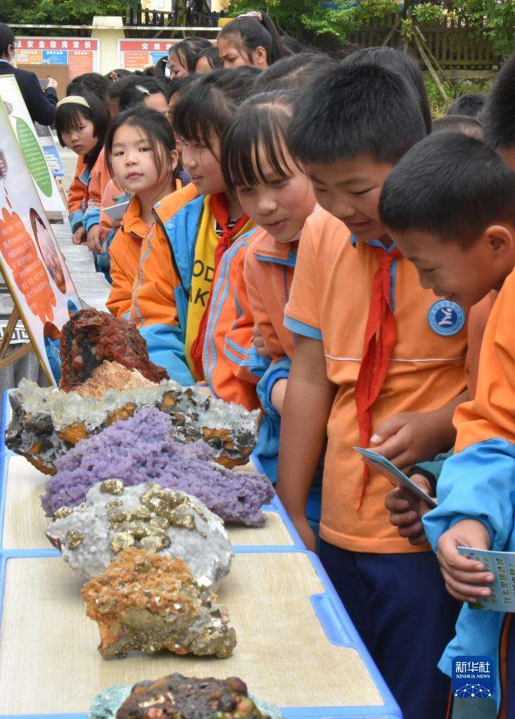 5月24日,贵州省惠水县惠民小学学生观看贵州省地质博物馆带来的矿晶实物。